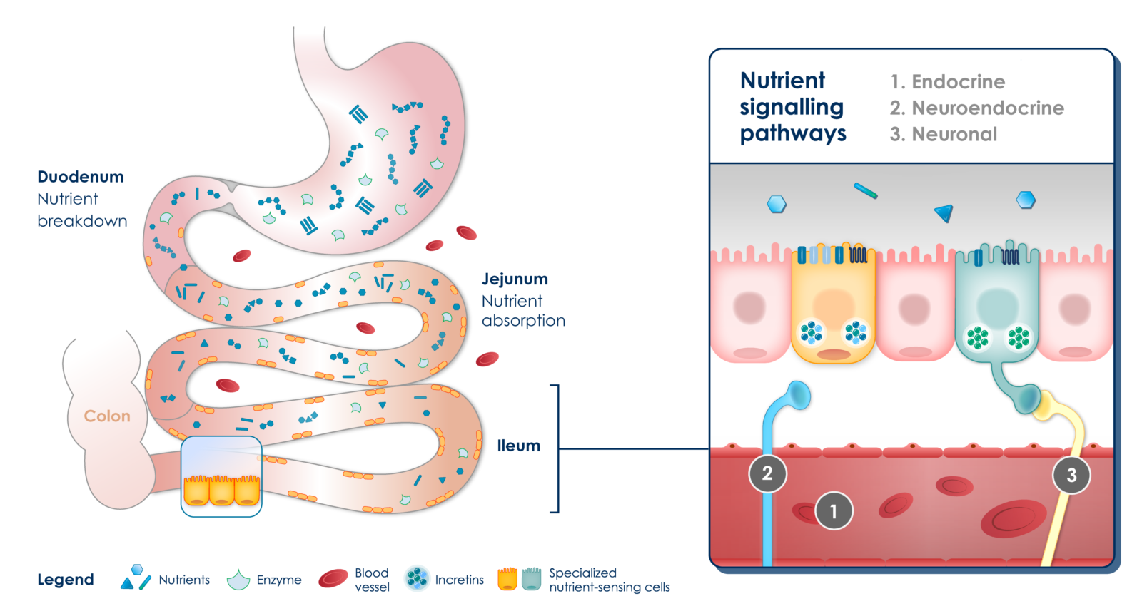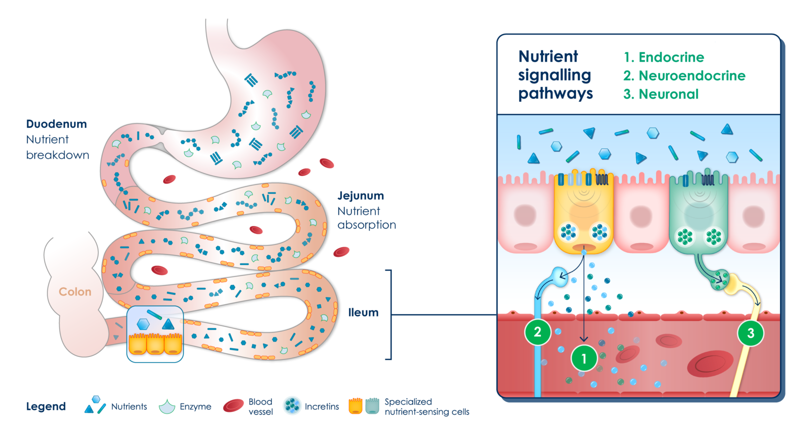Individuals with healthy enteroendocrine systems have a balanced nutrient absorption, where an excess of nutrients not absorbed in the upper parts of the small intestine (i.e., duodenum and proximal jejunum) stimulates nutrient-sensing endocrine cells and their broad repertoire of signaling mechanisms (i.e., endocrine, neuroendocrine and neuronal) in the distal parts of the small intestine (i.e., distal jejunum and ileum). The broad portfolio of mechanisms (including the release of incretin hormones) regulates various homeostatic functions like appetite and metabolic activity.