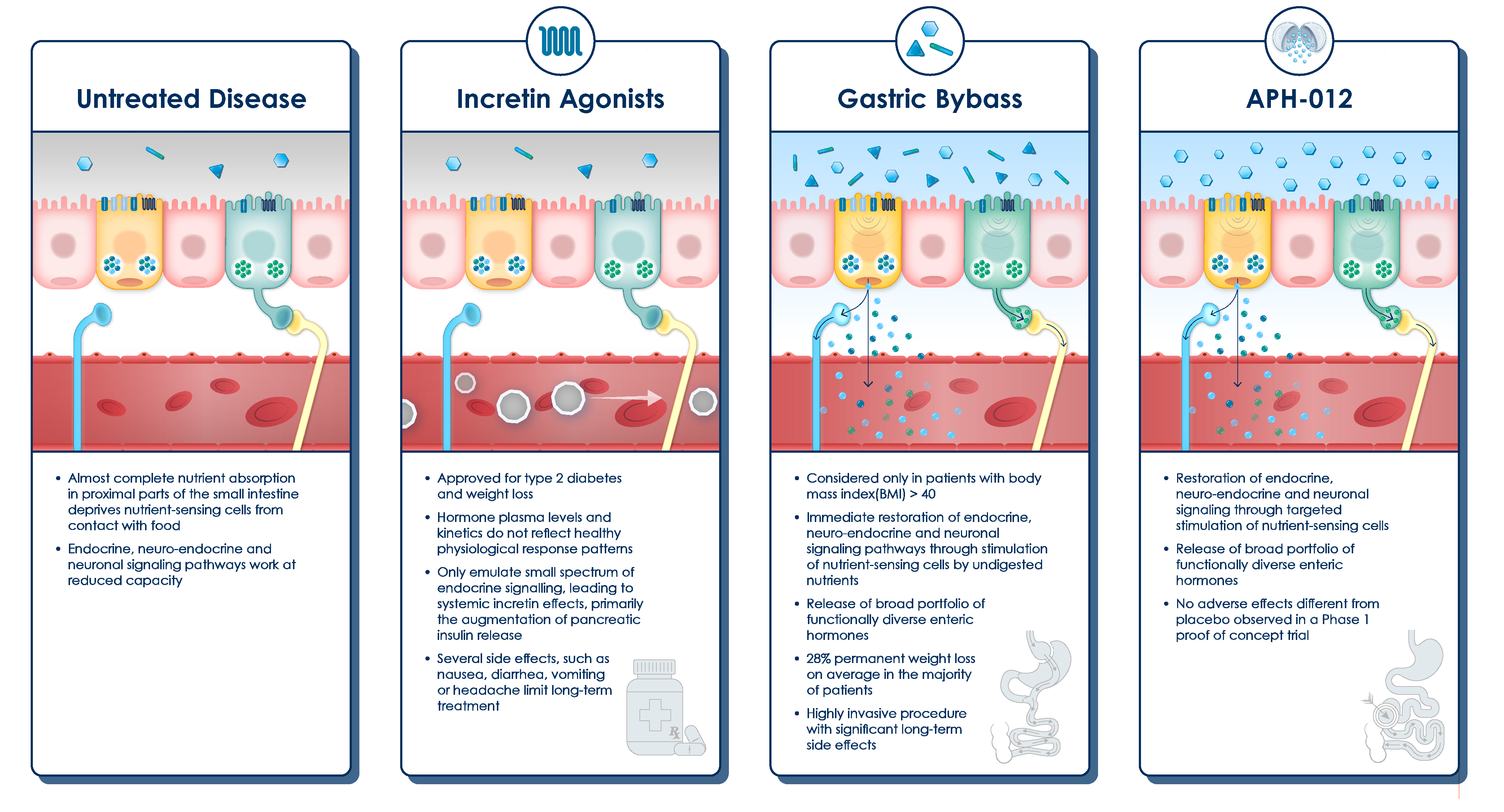 Aphaia’s lead candidate, APH-012, is an oral glucose formulation designed at discrete parts of the small intestine to stimulate nutrient-sensing cells and induce endocrine, neuroendocrine and neuronal signaling pathways that control multiple homeostatic and metabolic functions like appetite, hunger, satiety, glucose metabolism, energy expenditure, etc.