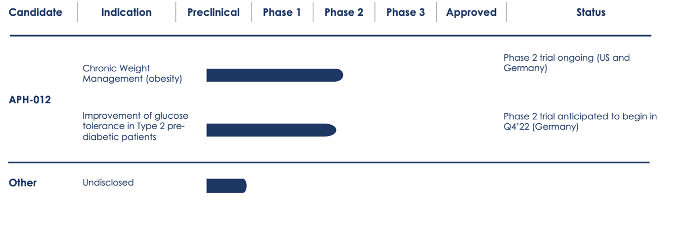APH-012 is being evaluated in a Phase 2 proof-of-concept study in 150 individuals with obesity. Patients will receive a once-daily oral dose of either APH-012 or placebo prior to main daily meals for 6 or 12 months. While the primary endpoint of the trial is the change from baseline in percent weight compared to placebo, the study will evaluate exploratory secondary endpoints, which are hallmarks of multiple metabolic diseases closely associated with obesity. Should trial outcomes be positive, this design will help expedite pipeline expansion into multiple other metabolic disease indications with high unmet medical needs.